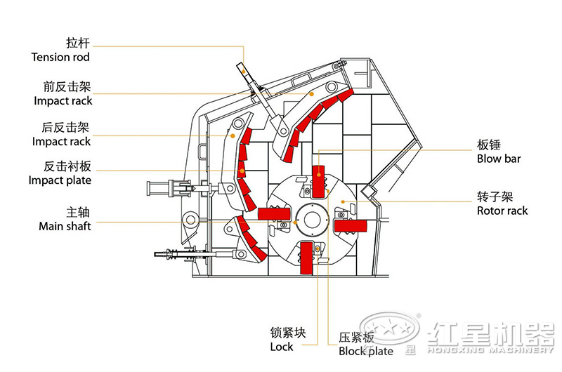 破碎的力来自两方面,一方面是物料间的互相碰击产生的作用力。另一方面,物料受到板锤的打击、与反击板的冲击产生的力,这些力共同作用物料,使物料不断产生裂缝,松散而致粉碎。当物料粒度小于反击板与板锤之间的缝隙时,就被卸出。调整反击架与转子之间的间隙可达到改变物料出料粒度和物料形状的目的。