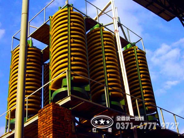经过洗矿筛分后的砂金矿进入重选流程粗选,含金量较低的砂金矿普遍采用砂金溜槽提金,砂金溜槽的处理能力大,选矿成本低,人工劳动强度较大,回收率低于跳汰机。含金量较高,要求较高回收率的可选用跳汰机作为粗选设备。(此流程所用到的砂金矿选矿设备:螺旋溜槽、跳汰机)