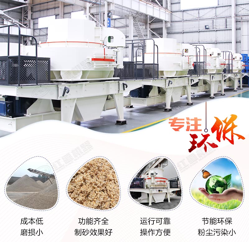 制沙设备的制砂过程中,主要是将物料放入破碎腔内,由破碎部件进行敲打、冲击、研磨等方式。使物料制成所需粒度,由排料口排口,即为成品。在整下破碎过程中,物料相互自行冲击破碎,不与金属元件直接接触,而是与物料衬层发生冲击、磨擦而粉碎,这就减少了角污染,延长机械磨损时间,提高整机寿命。